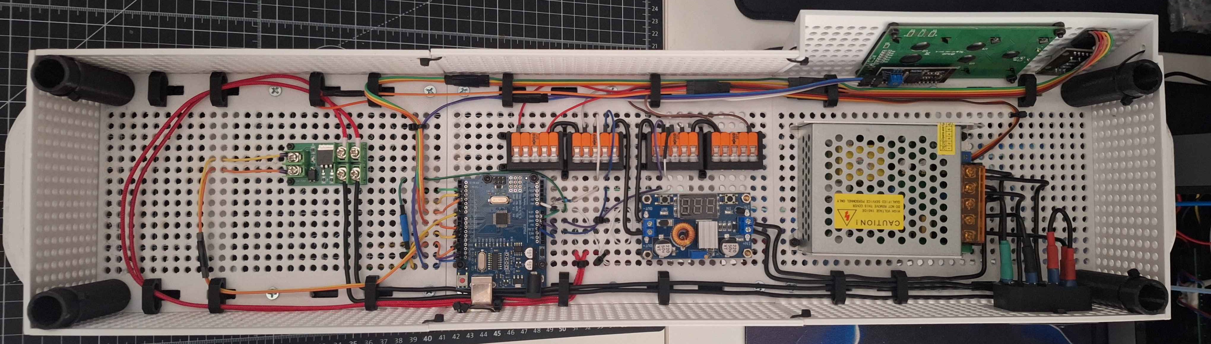 Systém je napájen 12V průmyslovým zdrojem. Pro logiku Arduina je napětí sníženo efektivním Step-down měničem. Celý obvod je jištěn tavnou pojistkou a silové spoje jsou realizovány přes spolehlivé WAGO svorky.