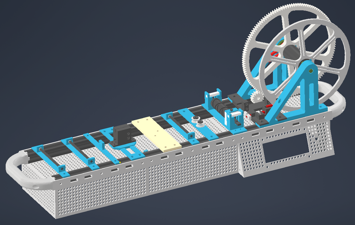 Pro posuv materiálu jsem navrhl systém s kontinuálním Arduino servem. Přestože má servo vlastní převodovku, doplnil jsem jej o další externí zpřevodování (viditelné velké ozubené kolo). Toto řešení poskytuje drtivý kroutící moment potřebný k protlačení tuhého plastu a zajišťuje stabilní, pomalý tah bez kolísání rychlosti.
