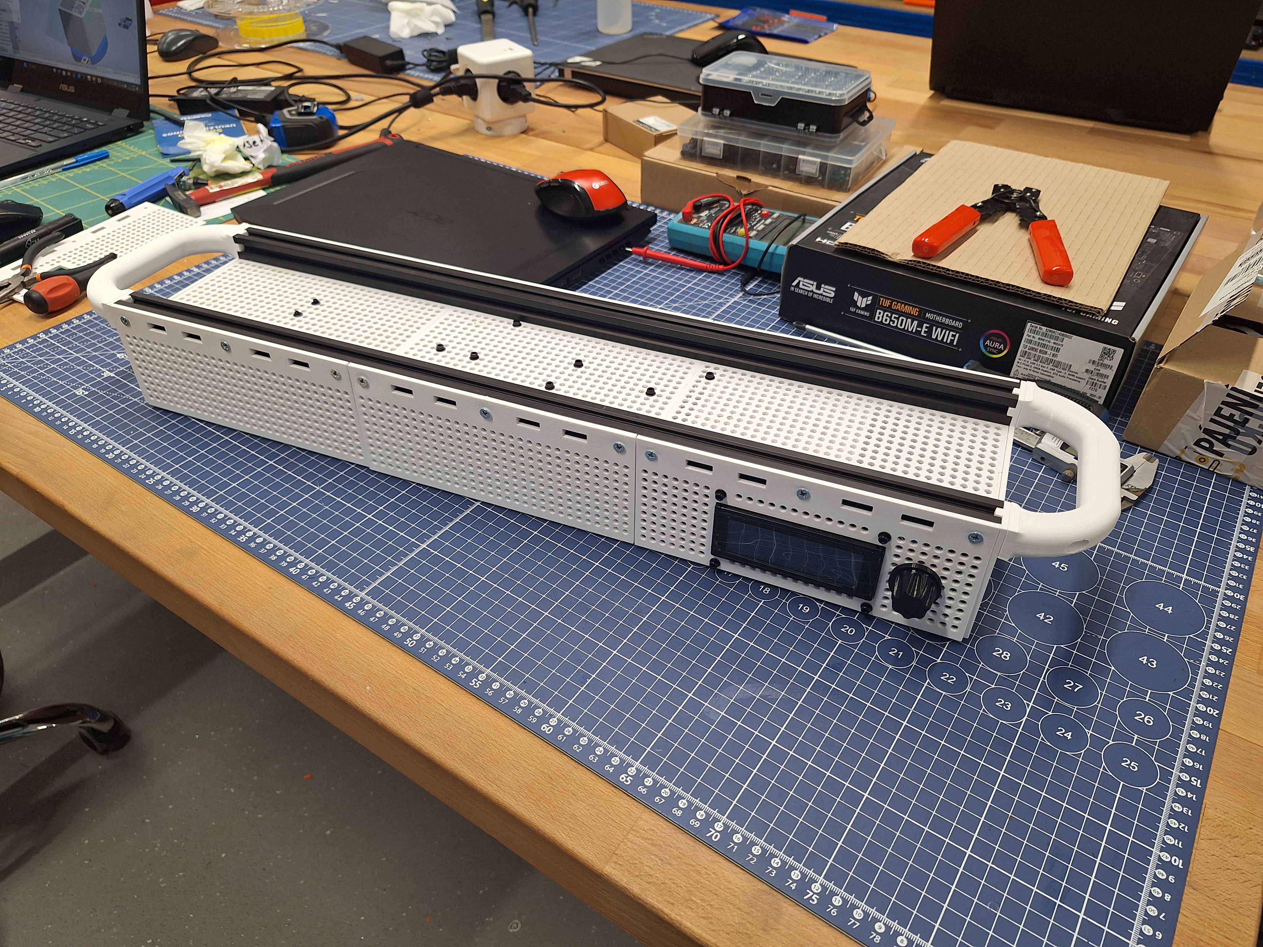 Dominantou panelu je 20x4 LCD displej, který zobrazuje veškeré telemetrické údaje (teplota, rychlost, stav). Ovládání je řešeno intuitivním rotačním enkodérem.